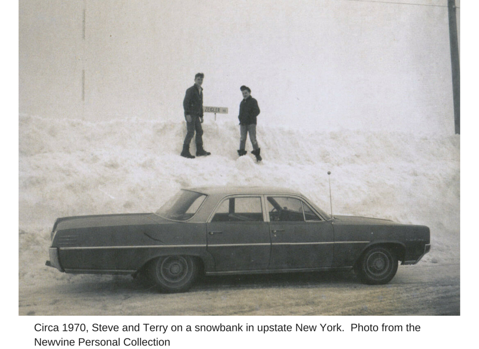 As you can see in this photograph, some winters were extra snowy in upstate New York when I was growing up in the 1960s and 1970s. That’s my brother Terry and me standing on top of the snowbank with the road sign at waist level. The family car, a 1964 Pontiac Star Chief (a topic of a Merced Sun Star essay I wrote about five years ago) is parked below.