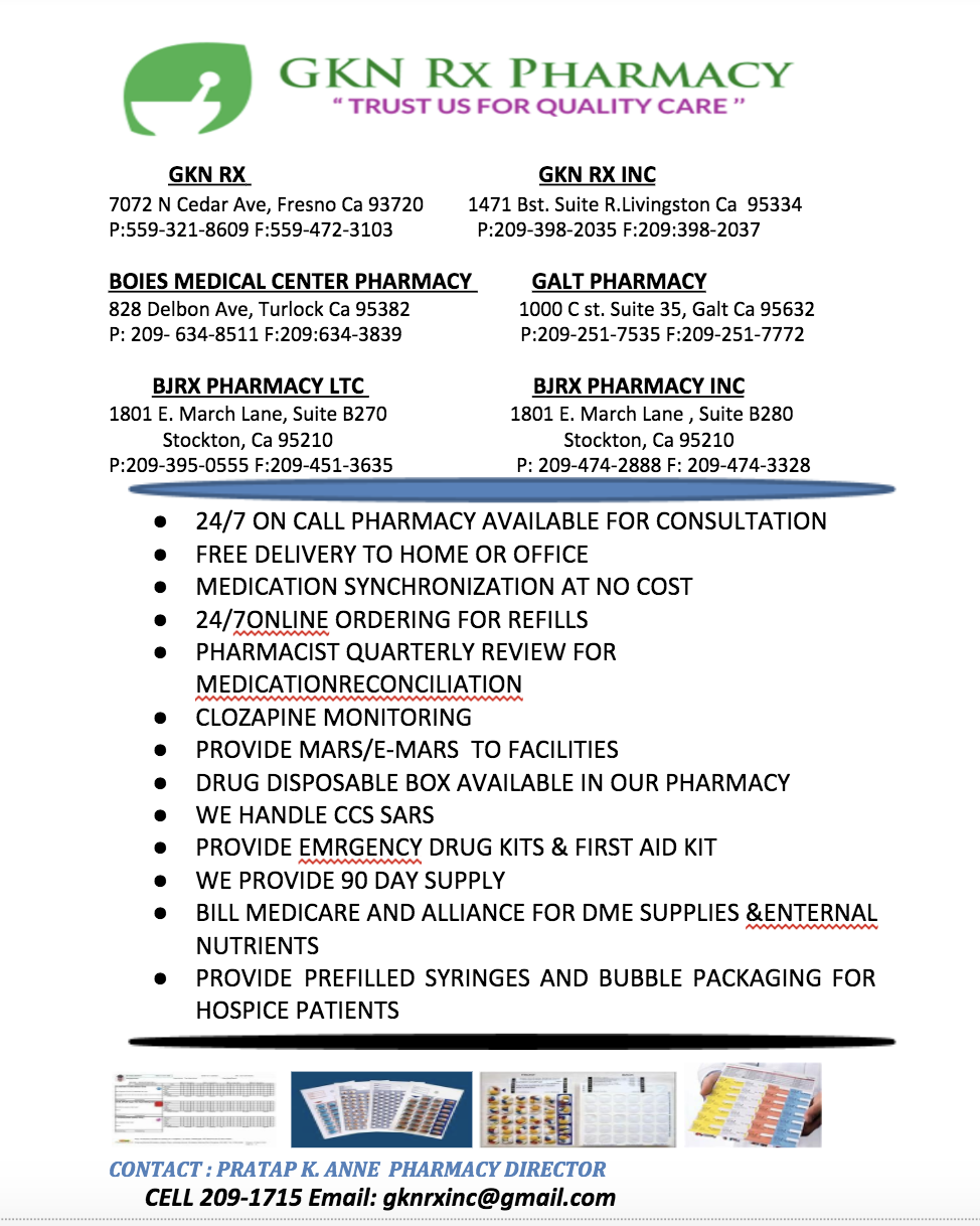 We have 6 pharmacies throughtout the valley starting in Fresno, Livingston, Turlock, 2 in Stockton and Galt.