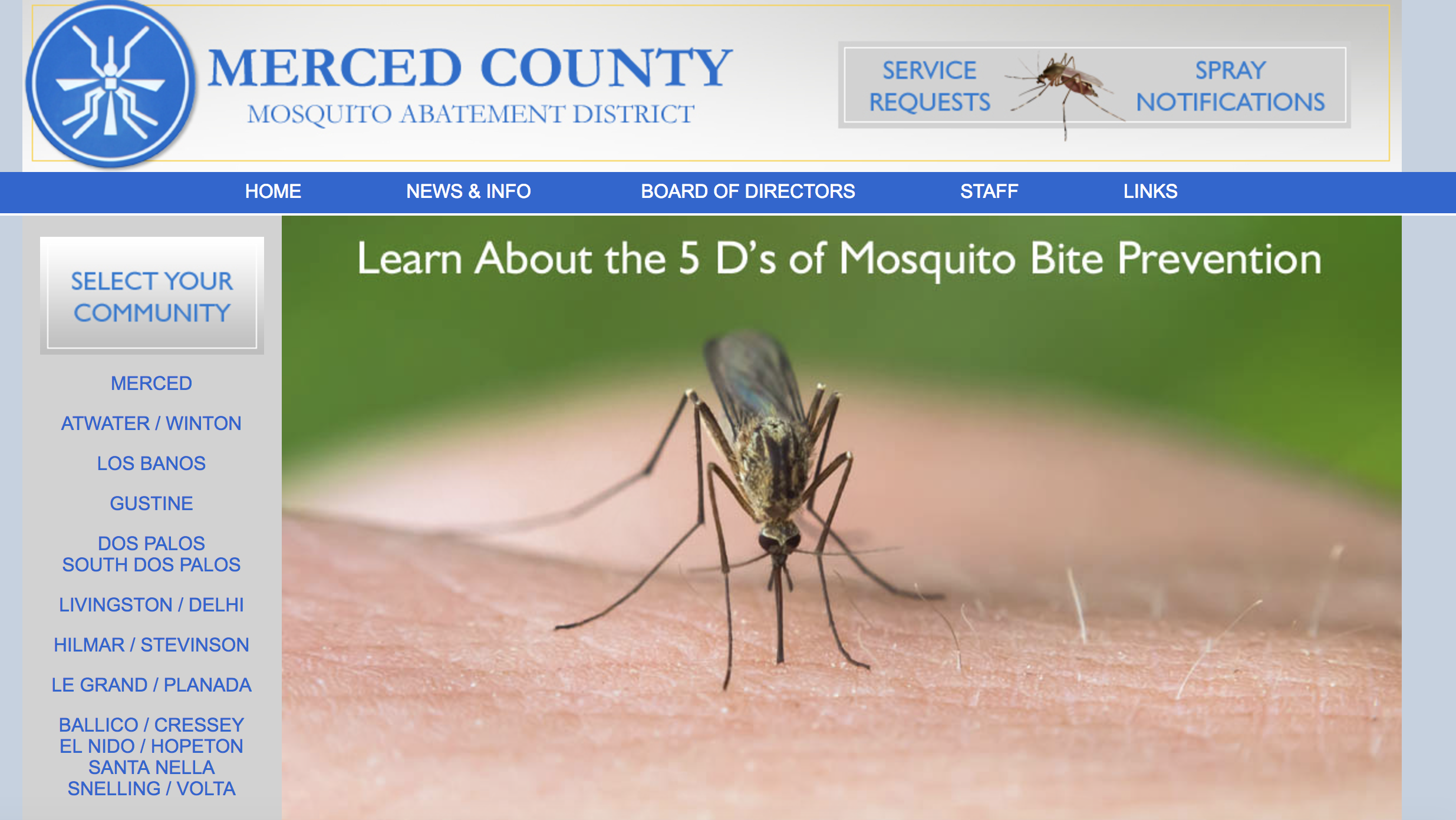 The purpose of the Merced County Mosquito Abatement District is to provide area-wide mosquito control, prevent mosquito-borne disease, and reduce economic loss and discomfort from pestiferous mosquitoes.