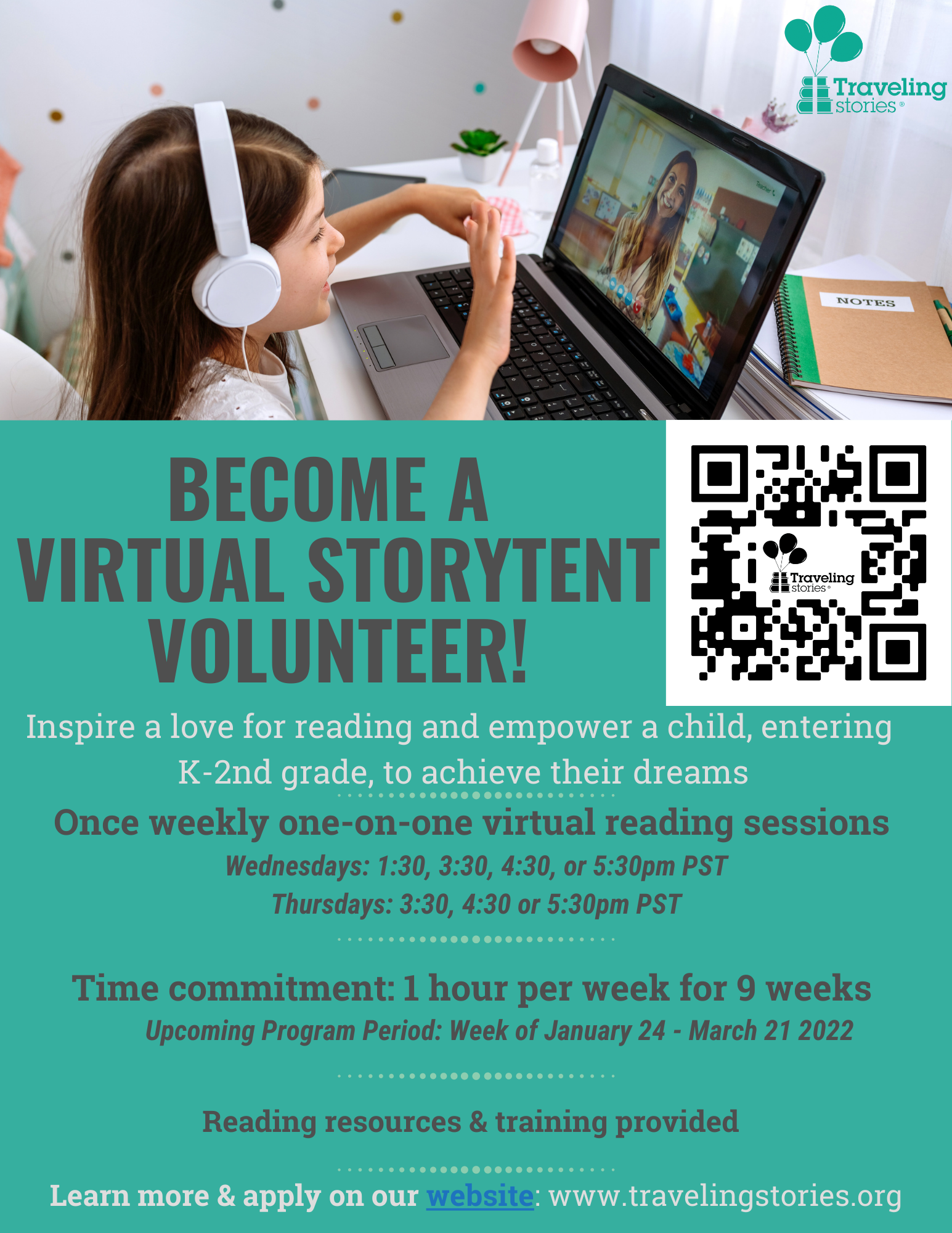 [https://www.travelingstories.org/][1]Traveling Stories believes through the power of reading and supporting children's literacy skills will have an impact on them to strive to reach their goals and dreams in life.